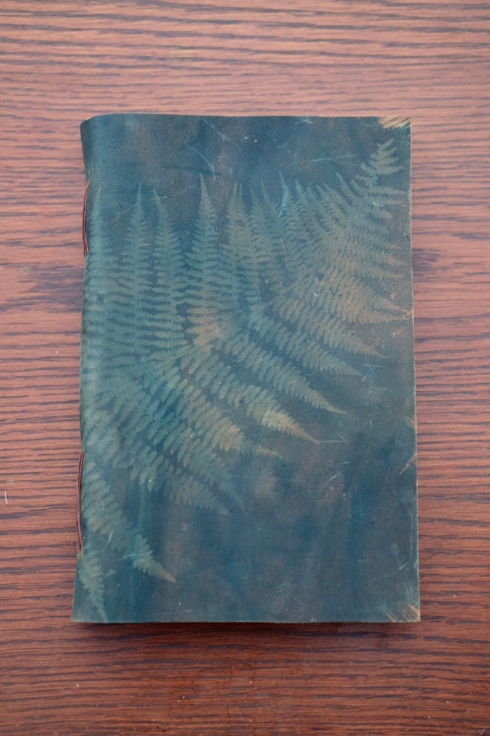 Like the fabric-bound notebooks, these are printed with the Cyanotype method and bound into unique notebooks and sketchbooks. They are made with recycled leather, using offcuts from various stores, turning something destined for the bin into a practical and sturdy book.